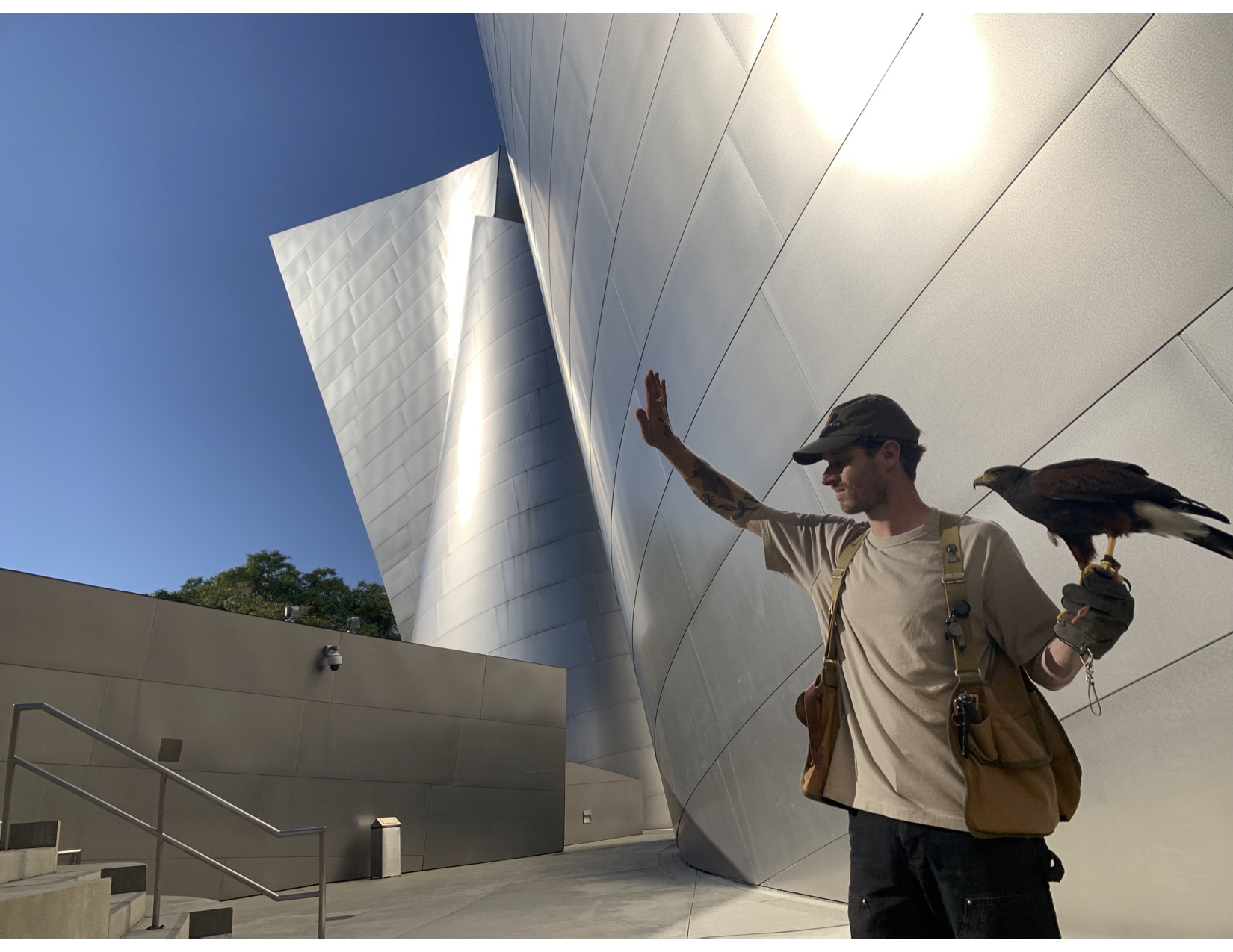 Urban falconer Adam Baz and his four birds chase ravens and photo shoots, powered by a pocketful of chopped-up critters.